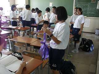 8月24日(月)の6校時、全校で応援用の小道具「ポンポン」を作りました。体育祭の組団の応援色のポンポンを丁寧に作りました。今年も7色のポンポンできれいに、しかも踊って応援します。