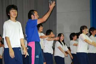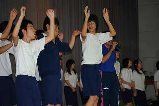 8月25日(火)の6校時、先週に引き続き9月1日に行われる市中陸上へ向けて応援練習が再開しました。全校応援リーダーも次第に慣れ、指導も全開です。1時間踊っていますので、だんだん熱くなってきています。
