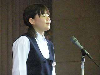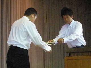 ※賞状を渡す生徒会長です。1位は4組団(青組団)、2位は2組団(桃組団)、3位は1組団(紫組団)となりました。