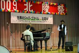 今回は、「世界のジャズ・ゴスペルin北陵中」と命名し実現したコンサート。1時間30分のあっという間のコンサート。ジョナサン・カッツさんの素晴らしいピアノ演奏、ネイザン・イングラムさんのボーカルに引きつけられました。素晴らしい演奏会でした。