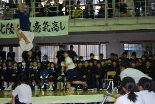 北陵祭の2日目のフィナーレ。最大の企画は「吹奏楽部と体操部、新体操部のコラボレーション」です。昨年度から始めたこの企画。北陵祭のメインの発表として定着してきました。今年もこの企画は大成功でした。たくさんのお客さんに見ていただきました。レベルの高い北陵中学校の吹奏楽部と体操部と新体操部であればこそできる北陵中学校の文化祭の目玉ステージとなりました。体操部の演技に「お〜」の感動の歓声。新体操部の華麗な演技。そして吹奏楽の演奏と、とても楽しい企画でした。