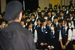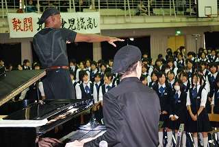 ネイザンさんとジョナサンさんのコンサートは音でいろいろ表現したりすごいです。ジョナサンさんはピアノですごく早く演奏してビックリしました。ネイザンさんは歌がとてもうまかったです。「マママ・・・」の合唱、すごくおもしろかったし、『we are the world』の合唱でネイザンの愛の手がおもしろかったし、いい思い出になりました。(2年女子)