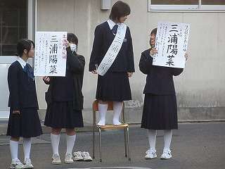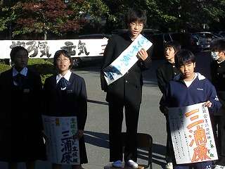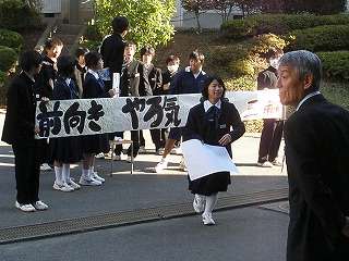 10月15日(木)の朝、生徒会役員選挙立候補者が大きな声で「投票の呼びかけ」が始まりました。昨日よりも各候補者のアピールが大きくなってきました。椅子の上で呼びかける立候補者、大きな横断幕でアピールする候補者、立候補したのですがインフルエンザのため呼びかけができず責任者が大きな声で呼びかけている生徒など、候補者のパフォーマンスも激しくなってきています。元気のいい大きな声で、朝が始まります。10月20日(火)が立合演説会と投票日となっています。