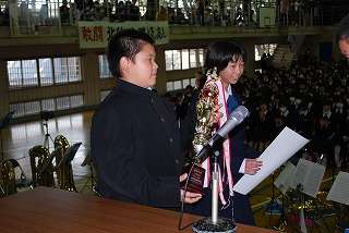 3年生の部の最優秀賞は3年4組の『はじまり』でした。優秀賞は3年7組、優良賞は3年1組と3年5組、努力賞は3年2組、3年3組、3年6組でした。みんな頑張りました。指揮者賞は、3年1組の荒谷くんと3年6組の熊本くんでした。