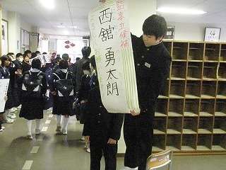 今日も生徒会役員選挙立候補者が大きな声で「投票の呼びかけ」で一日が始まりました。今朝はあいにくの雨で、校舎内での選挙活動になりました。今日が最終日ということもあり、各候補者のアピールが大きくなってきました。椅子の上で呼びかける立候補者、大きな横断幕でアピールする候補者など、候補者のパフォーマンスも激しくなってきています。元気のいい大きな声で、朝が始まります。いよいよ明日10月20日(火)が立合演説会と投票日となっています。