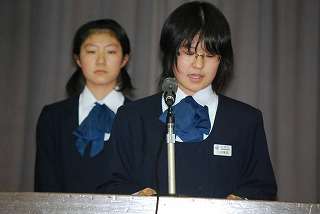 ※生徒会役員選挙で全校生徒へ自分の公約を堂々と発表する候補者です。
