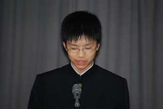 ※生徒会役員選挙で全校生徒へ自分の公約を堂々と発表する候補者とその責任者です。立候補者がインフルエンザで欠席のため、責任者の3年生が代弁しました。