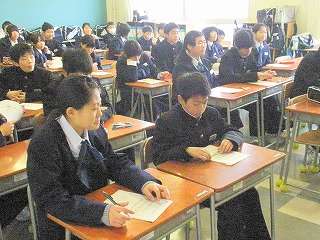 11月10日(火)の1校時、どの学級も来週行われる「後期生徒総会」の議案書審議を行いました。「後期の生徒会執行部の全体方針や局委員会の方針」を話し合って、さらに「3年生を送る会」をいつもでは2月に実施しているのですが、今年度は「新型インフルエンザ」の影響を考え「2月から12月に実施時期を変更するが、私たち1,2年生はこの3年生を送る会をこの時期にできるか、それとも中止するか」を話し合いました。