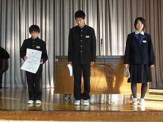 12月1日(火)今月最初の全校朝会を行いました。生徒会から、「学習コンクール取り組み」と「3年生を励ます会」の呼びかけが行われました。生徒会では、4日(金)の「3年生を励ます会」の成功を目指して取り組んでいます。