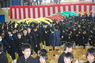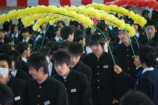 ※12月4日(金)に行われた『3年生を送る会』の様子です。3年生の入場の様子です。美化局で準備したアーチを通っての入場です。