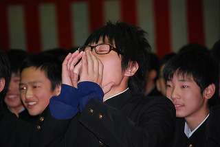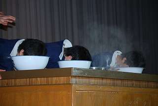 ※恒例の男子バスケット部の先輩を激励する芸も磨きがかかってきました。コーラの一気のみ、生卵とオロナミンCの早飲み、小麦粉の中からバームクーヘン探しと今年のバスケット部も熱い戦いが展開されました。