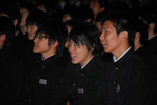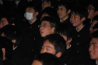 ※3年生の先生方は、生徒の入学から現在までの成長の様子をがリーンの音楽に合わせ歌いながら「ビデオ上映」をしました。1年生の頃の様子や2年生の楽しかった日々を思い出し、大きな歓声がわきました。3年生の先生方も一生懸命歌いました。