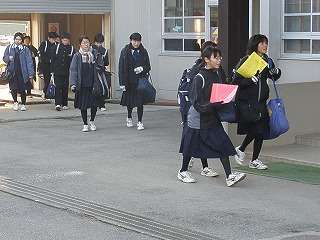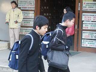 ※12月10日(木)元気に登校する様子です。校長先生は出張のため朝のあいさつができません。代わりに先生に立っていただきました。校門近くで塾のテストの案内をもらって登校していました。