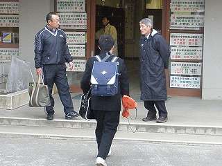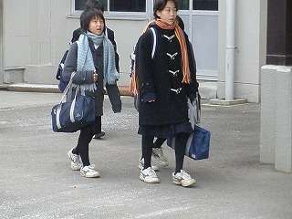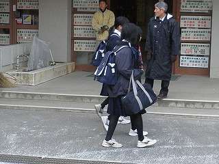 ※12月15日(火)元気に登校する様子です。校長先生もほうきで雪払いをし、生徒を迎えます。