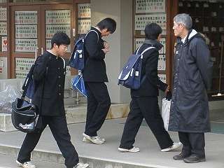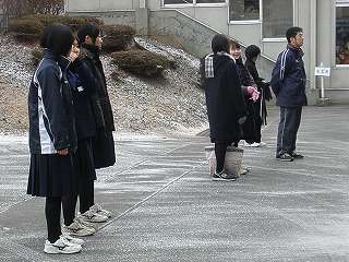 ※12月16日(水)元気に登校する様子です。校長先生もほうきで雪払いをし、生徒の登校を待っています。