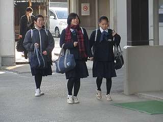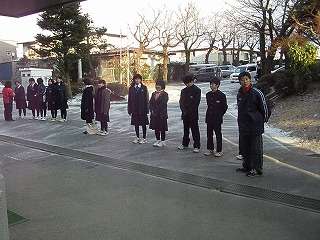 ※12月16日(水)元気に登校する様子です。校長先生もほうきで雪払いをし、生徒の登校を待っています。