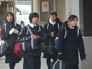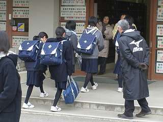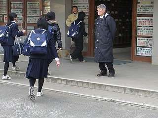 ※12月16日(水)元気に登校する様子です。校長先生もほうきで雪払いをし、生徒の登校を待っています。