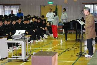 12月4日(金)午後1時45分から『3年生を励ます会』が行われました。今まで2月下旬に行っていた『3年生を送る会』を12月実施にした生徒会企画です。「今年は、中止にしようか?」と考えていましたが、生徒会執行部が「自分たちで取り組んで成功させます。取り組ませてください」と要望があり実現した企画です。短時間での練習でしたが、1,2年のリーダー達はよく取り組んでくれました。楽しい企画になりました。