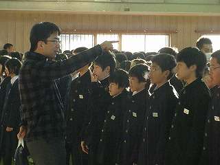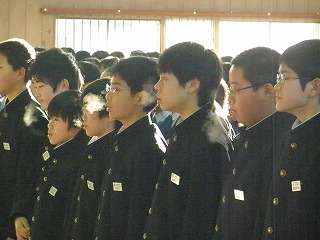 ※12月15日(火)2学期最後の全校朝会の様子です。1年生は「ゴジラ」のように白い息を吐いて合唱中。