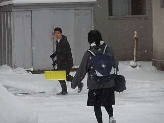 ※12月18日(金)雪かきをする生徒の様子です。先週に引き続き雪払いをするために6時55分に出勤しました。生徒昇降口付近の雪は校長先生がすでに払っていました。すごいです。先を越されましたので、ラポム前までの歩道の雪払いをし登校の道を作りました。