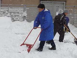 いつも練習場所をお借りしている「みたけ活動センター」ですが、今日5日(火)の部活動は9時から12時まででしたが、8時30分に集合しまずは駐車場の雪かきを行いました。この日に雪は多く、1時間ほどかけて雪かきをしました。用具をたくさん出していただき、一気に雪をかきました。結構な運動量でした。1時間ほどできれいになりました。その後練習を始めました。この日も大学生2人来てもらい、指導していただきました。