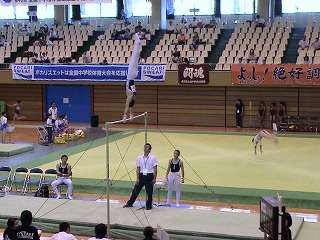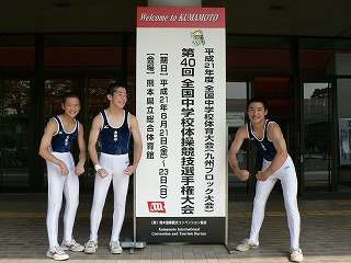 8月21日(金)から熊本県立総合体育館で行われた「全国中学校体操競技選手権大会」に出場しました。北陵中の演技は、規定演技で74.825の15位(参加団体数・・16)ビリから2番目でした。翌日の自由演技では、24.6でした。規定演技と合わせて、150.825と、一つ順位を上げることができました。ちなみに、団体優勝したのは私立武蔵野東中(東京都)の171.825!全国大会はスゴイです。素人の人が見ても、技の難易度の高さ、完成度も高さを感じですばらしい大会でした。