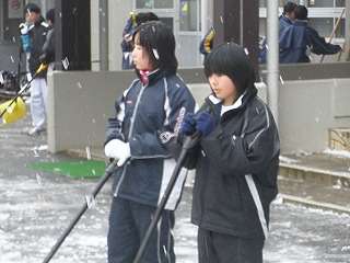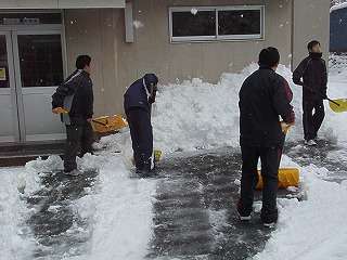 今日の仕事も「雪かき」からでした。7時過ぎに出勤しましたが、昨日同様すでに校長先生は昇降口前の雪払いをしている最中でした。今日の雪は湿り気が多く重たいこと重たいこと。今朝は、朝のトレーニングの生徒にも手伝ってもらいました。徐々に手伝ってくれる生徒が多くなり、大助かりでした。