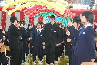 12月4日(金)午後1時45分から『3年生を励ます会』が行われました。今まで2月下旬に行っていた『3年生を送る会』を12月実施にした生徒会企画です。「今年は、中止にしようか?」と考えていましたが、生徒会執行部が「自分たちで取り組んで成功させます。取り組ませてください」と要望があり実現した企画です。短時間での練習でしたが、1,2年のリーダー達はよく取り組んでくれました。楽しい企画になりました。