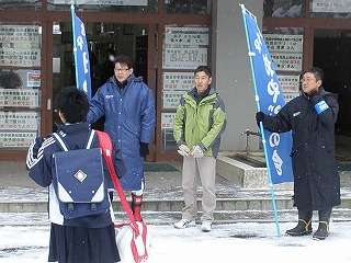 ※1月14日(木)3学期初めて登校する生徒の様子です。「学期の始まり」ということもあって、今日はPTA会長はじめ、「おやじの会」の方々も挨拶運動に取り組んでいただきました。校長先生から「元気のいい挨拶が聞こえました」とほめていただきました。