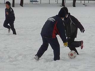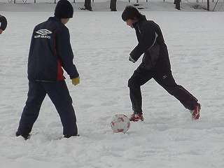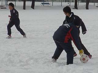 ※1月7日(木)雪の校庭でドリブル練習をするサッカー部の活動の様子です。30日(土)、31日(日)遠野市でフットサル県大会が行われます。