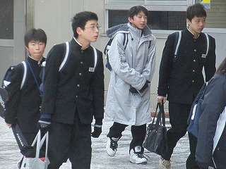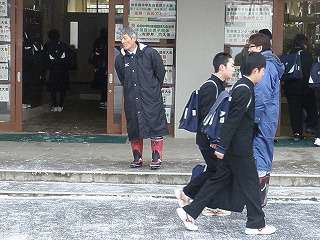 ※1月15日(金)登校する生徒の様子です。「学期の始まり」ということもあって、今日はPTA会長はじめ、「おやじの会」の方々も挨拶運動に取り組みました。