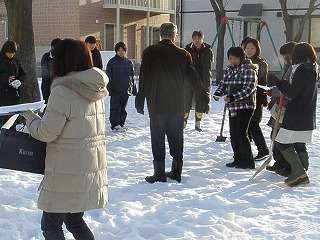 月が丘の活動を取材に行きましたが、雪かきができませんので「消火栓の周りの雪をかき、融雪剤をまく」活動をしていました。活動後には「おもち」を食べるように準備をしてくれていました。