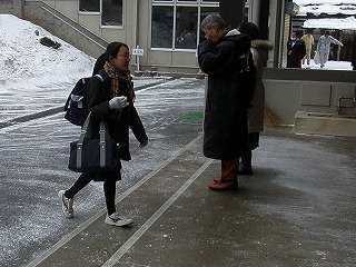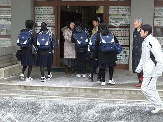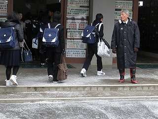 昨日の雪なのか雨なのか分からない天気から一変して寒い朝となりました。道路が凍って、その上にうっすら雪が降りましたので「道路の滑ること、滑ること」。登校指導している校長先生も「手を出してください」と生徒に声を掛けます。滑りやすい状況の中での登校ですから、万が一転んだ場合にも「すぐに手が出るような状況」にしておかないと大変なけがをします。すべて自分の身を守るためです。
