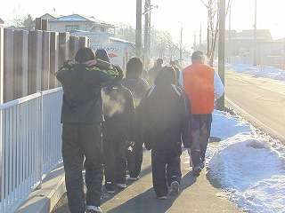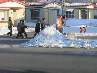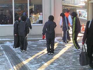 駅伝メンバーは、今日も「県交通滝沢営業所をこえ、JA牧野林」までの往復の練習となりました。この道のりを2往復してのトレーニングです。とにかく、雪のない歩道を探して駅伝部はトレーニング中でした。