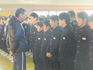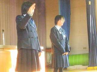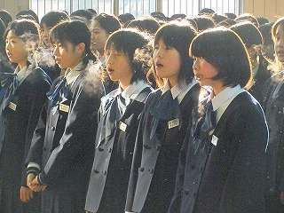 2月2日(火)2週間ぶりの「全校朝会」が行われました。この日は寒い朝でしたので、合唱練習が始まると前列の1年生からは「ゴジラの放射能」のように、白い息を吐き合唱が始まりました。