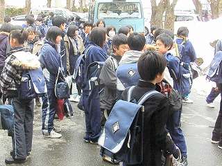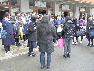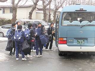 2月8日(月)生徒会執行部と各部の部員は、手分けをして城北小学校と北厨川小学校と月が丘小学校へ向かいました。城北小学校へは徒歩で、北厨川小学校と月が丘小学校へは、バスで向かいました。なにやら緊張している中にも、ウキウキ気分で出発しました。