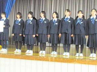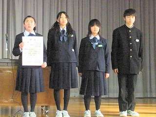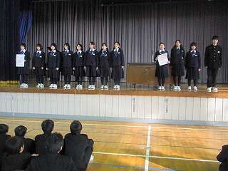 2月16日(火)寒い朝でした。この中全校朝会が行われました。吹奏楽部からはアンサンブルコンテスト東北大会で打楽器四重奏は岩手県唯一の金賞、クラリネット八重奏は銅賞」の報告が、ハンドボール部男子の高橋くんからは、「1回戦突破」の報告がありました。