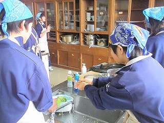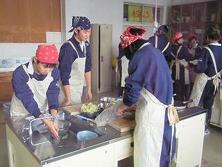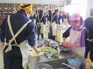 2月4日(木)の3,4校時、調理室から「いい匂い」がしてきました。その匂いに引き寄せられて、調理室へお邪魔しました。2年1組の皆さんが、ハンバーグと野菜サラダを作っていました。調理の様子を「パチリ」。さらに、試食中を担任の先生が「パチリ」と写真を撮りました。