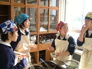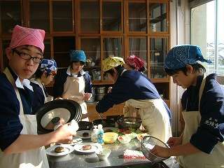 2月4日(木)の3,4校時、調理室から「いい匂い」がしてきました。その匂いに引き寄せられて、調理室へお邪魔しました。2年1組の皆さんが、ハンバーグと野菜サラダを作っていました。調理の様子を「パチリ」。さらに、試食中を担任の先生が「パチリ」と写真を撮りました。