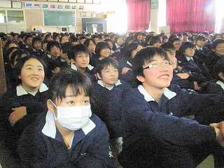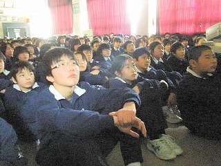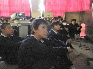 ※2月22日(月)携帯電話のビデオを見る1年生の様子です。校長先生は「中学生には携帯電話は必要ない。持たせないでほしい」といつも言われています。