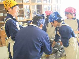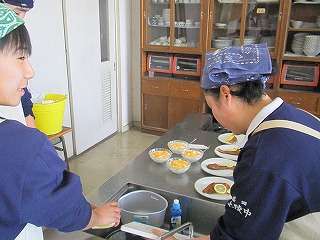 2月22日(月)の3,4校時、2年1組が調理実習中でした。覗いてみると、「サケのムニエル」と「フルーツ入りのヨーグルト」の実習中でした。4校時でしたので、お腹がすいています。