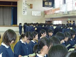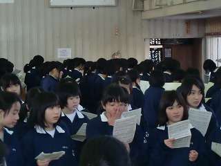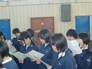 2月23日(火)の4校時、音楽科の先生の指導の下、1,2年生の合唱練習が始まりました。毎週1,2年生が2回体育館に集まりパート練習です。曲目は「贈る言葉」と「大地賛頌」です。3年生へ感謝の気持ちを込めて合唱をします。いよいよ卒業式へ向けて、準備開始です。