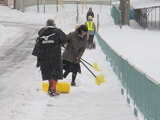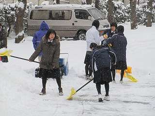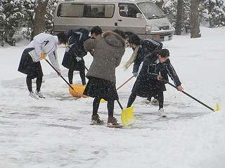 前日の夜から降り続いている雪。10センチ以上の積雪です。昨日は校庭で部活動をしている様子を撮影したばかりなのに、再び校庭での練習ができなくなってしまいました。朝登校してきた「吹奏楽部の皆さん」と「朝のトレーニング参加者」と一緒に雪かきの朝でした。