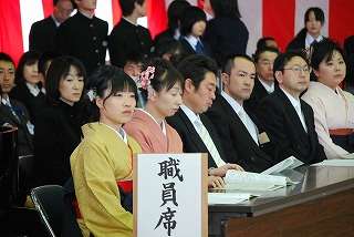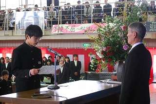 ※3月13日(土)の卒業式の様子です。卒業生の皆さんから「和太鼓1張り」が贈られました。「体育祭や市中陸上応援に使ってください。」と代表者から言葉をいただきました。