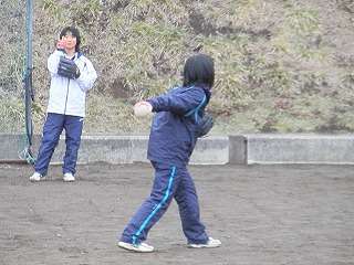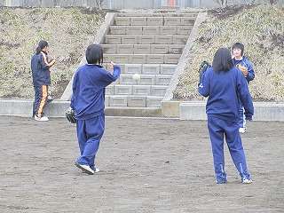 ※3月2日(火)ソフト部の活動の様子です。キャッチボールの最中でした。雪は溶けてきましたが、まだまだぬかるんでいますので、比較的乾いている狭い場所での練習でした。