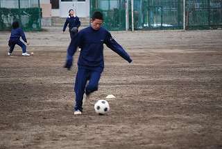 ※3月9日(火)サッカー部の活動の様子です。顧問の先生がついて、ドリブル練習の最中。久しぶりの土の感触を味わっていました。