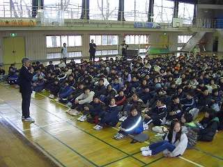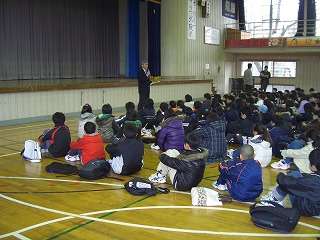 体育館に集合し、全体説明を受けました。その後、各教室に移動