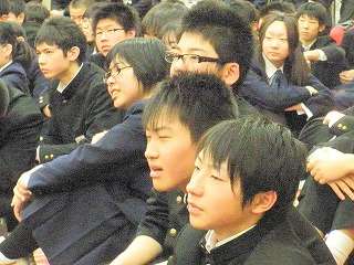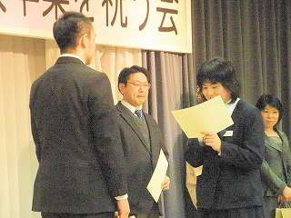 卒業式終了後、卒業生と保護者の方々で「卒業を祝う会」を開いていただきました。昼食を食べ、先生方への感謝の会でした。特に「卒業を祝う会」を開くまでに、役員の方々は話し合いを何度も行い準備をしていただきました。学年会長さんから「この会を開く会場まで、生徒を連れてくるのだけでも大変でした。そんな250人を超える生徒たちを先生方には修学旅行に連れて行っていただきましたし、学習や生活と3年間大変お世話になりました。」と感謝の言葉が印象的でした。