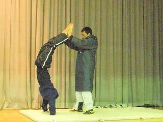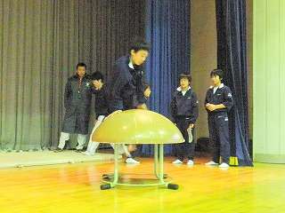 ※3月2日(火)、体操部の部活動の様子です。ステージの上での練習です。1年生だけで頑張っています。