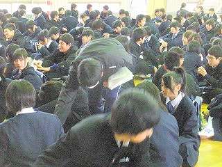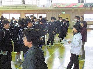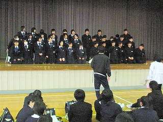 ※4月12日(月)の学年集会の様子です。担任の先生がザックや服装、頭髪点検をしました。写真撮影隊形の練習もしました。